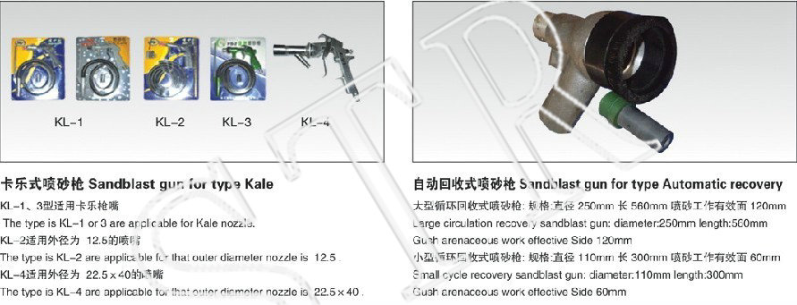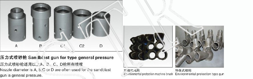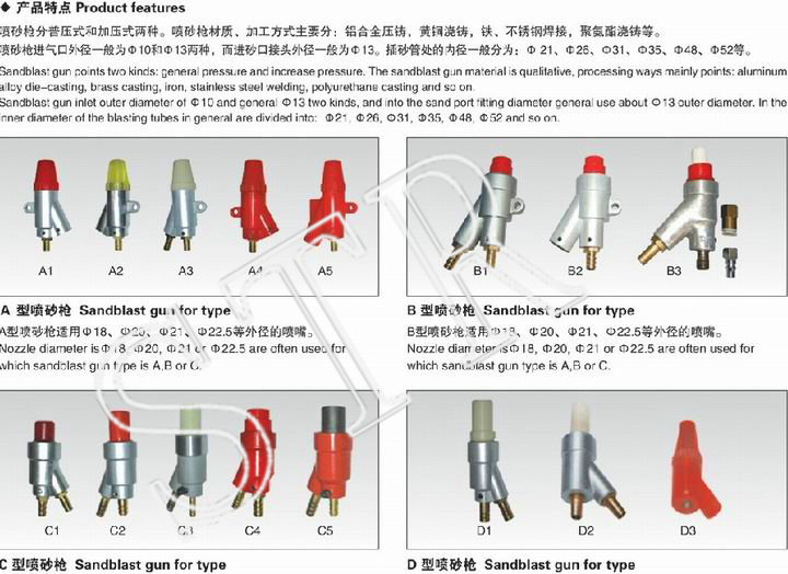 噴砂槍分普壓式和加氧式兩種行為。噴砂槍材料、精加工行為其主要分:鋁鎳鋼壓鑄,紫銅澆鑄,鐵、不銹鋼圓管激光焊接,丙烯酸澆鑄等。