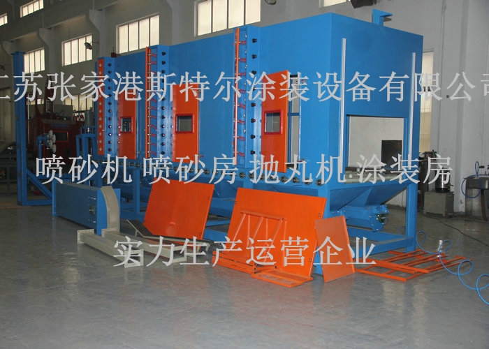 方形坩堝產品內壁處理要求而專門設計的專用型輸送式自動噴砂機,適合需求公司所提供的產品。根據需求公司對產品效率的要求,本機設置一套自動輸送線,共分五段線體。噴砂艙內共設三個噴砂位,工件通過輸送線體帶動步進方式分別在三個噴砂位進行噴砂加工清理,噴砂區域內共布置20支普壓高速噴砂咀,在噴砂區第一個噴砂位布置8支噴咀噴工件內底面,在噴砂區第二個噴砂位布置6支噴咀噴工件內前后側面,在噴砂區第三個噴砂位布置6支噴咀噴工件內左右側面,噴咀可根據加工需要,適當調整其噴射角度,其自動化程度較高。每個工件需間歇進行三次噴砂清理加工,才能完成整個內表面的清理。在出口處設有翻轉機構,用于傾倒內部的砂料,該動作自動完成,無需人工操作。 噴砂制作工藝程序流程